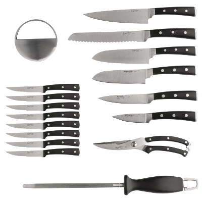 This 20 Pc knife set has Ice hardened blades constructed from high carbon steel. The cutlery set is lightweight, hand-sharpened and perfectly balanced for optimal cutting and ease of use. Ergonomic handles are triple riveted for extra strength and designed for a comfortable and secure grip. Set includes 8″ chef knife, 8″ bread knife, 7″ Santoku, 5″ Santoku 5″ utility knife, 3.25″ paring knife, 10″ poultry shears, 8X 4.5″ steak knives, 8″ sharpening steel, herb cutter and mincer, swivel rotating base, detachable steak knife block and cutting board.