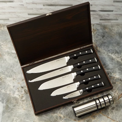 - Package includes: Carving knife 8.25 inches, Chef’s knife 8 inches, Santoku knife 7 inches, Santoku knife 5 inches, Paring knife 3.25 inches, wood case and knife sharpener