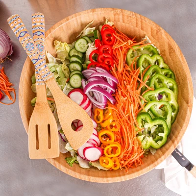 - Set includes bamboo 10″ Utensil/flatware caddy, 14″ Salad bowl, 4x Trivets, and 6x 12″Patterned utensils (Slotted Spatula, Spatula, Slotted Spoon, Serving Spoon, Spaghetti Spoon, Salad Spoon). Blue patterns on handles and trivets.