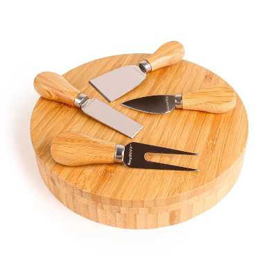 Great addition to any home, this circular bamboo plate has a multi-functional space efficient design. To open, the top swivels out revealing hidden compartment that holds four different cheese knives with stainless steel blades. Hold fruit or cheese on top for an eye catching centerpiece. Durable and natural bamboo that is absorbs very little moisture. Slide-out tray that covers the knife compartment for space saving. Matching compartment is deep enough to store four knives. Perfect serving set for every gathering