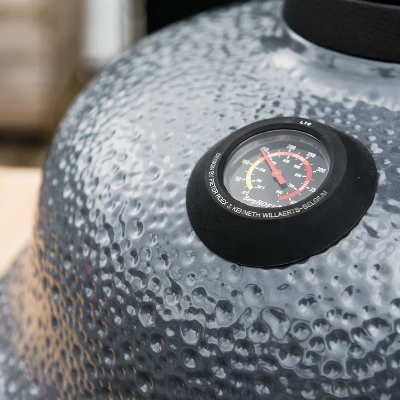 The ceramic shell produces high temperatures for searing, roasting and grilling, but also allows for low-temperature smoking. Constructed for a uniform heat circulation resulting in fast and consistent cooking. The top venilation cap allows you to control the air with precision and the thermometer on the lid monitors the temperature inside for precise cooking with perfect results. Fired with lump charcoal or aromatic woods. High quality, top of the line construction.