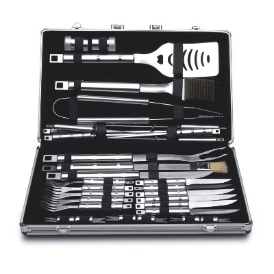 - Package includes Salt cellar 2.5″, Pepper pot 2.5″, 6 x Corncob holders 2.25″, 6 x Steak knives 10″, 6 x Steak forks 10″, Barbecue knife 16.5″, Grill scraper 18″, Slotted turner 18″, Small brush 18.5″, Meat fork 18.5″, Tong 18.5″, 6 x Skewers 18.5″, and carrying case.