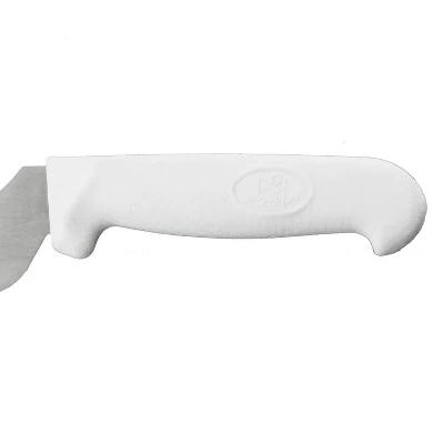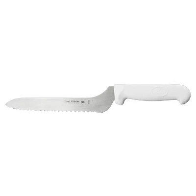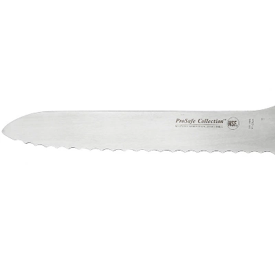 9″ Scalloped Offset Bread Knife is made from high quality, ice hardened stainless steel, these knives feature ergonomically designed black, soft grip, thermo plastic handles. Easily sharpened and holds their edge well. The handle is safe, high impact, slip resistant as well as antimicrobial and micro-organism safe. The knife is and low temperature resistant and safe to use in the freezer.