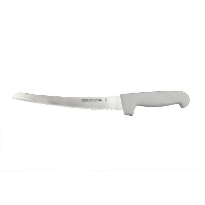 9″ Serrated Bread knife is made from high quality, ice hardened stainless steel, these knives feature a white polypropylene handle with a checkered pattern. Easily sharpened and holds their edge well. The handle is safe, high impact, slip resistant as well as antimicrobial and micro-organism safe. The knife is and low temperature resistant and safe to use in the freezer.