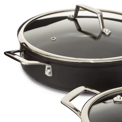 - HARD ANODIZED: This high-quality hard anodized pots and pans collection provides exceptional durability and superior heat distribution. Its aluminum body ensures a fast and even heat distribution for energy-efficient cooking. The long and ergonomic stainless steel handle not only prevents burns but also offers a safe and comfortable grip for secure lifting while the helper handle increases safety and support. Hanging loop that allows for easy storage and minimal kitchen space.