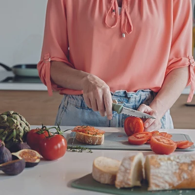 - 3-PIECE SPECIALTY SET: Vegetable knife 4.25″, Small chef’s knife 5.5″, Utility knife 4.5″, Forest. Crafted from High-quality Stainless Steel with a sleek satin finish. This set is made from recycled polypropylene and thermoplastic rubber and features an ergonomically designed handle for a comfortable and secure grip.