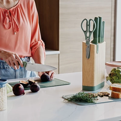 - 6-PIECE VERSATILE SET: Chef knife 7.5″, Bread knife 9″, Carving knife 7.5″, Utility knife 4.5″, Paring knife 3.25″, Knife block 9″ x 7″ x 3″, Forest. Crafted from High-quality Stainless Steel with a sleek satin finish. This set is made from recycled polypropylene and thermoplastic rubber and features an ergonomically designed handle for a comfortable and secure grip. Heavy-duty stylish wooden block with integrated magnet for scissors, and built-in knife sharpener.
