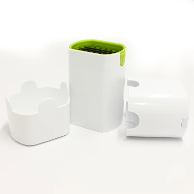 - Stainless steel french fry cutter with a plastic cover and green ABS body