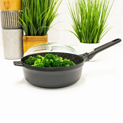 - Made of Non-stick Ferno-Green,PFOA Free coating Cast Aluminum. Easily detachable handle that allows for use in the oven and space-efficient storage. Stay-cool handle, Glass lid with silicone rim-dripless pouring.