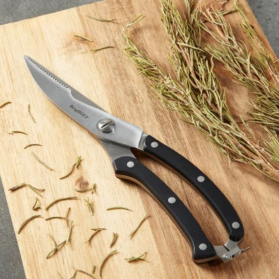 - Bread knife’s serrated blade allows for smooth, even slices without crushing delicate, soft insides. Poultry shears feature a safety clip and easy disassembly for easy cleanup. The carving knife’s narrow and curved blade glides right through cooked meat and poultry, ideal for the precision cutting of thin slices of meat.
