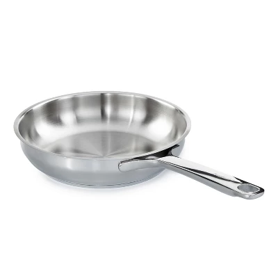 - Recycled 18/10 stainless steel 9.5″ Fry Pan 2.3qt. with long, ergonomic comfort-grip handle. Hanging loop for easy storage.