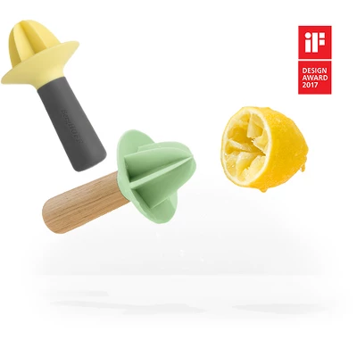 - 5″x2.75″ Hand juicer made with recycled materials and equipped with recycled soft-touch PP handle. The head of this hand juicer is made from glass fiber reinforced PP.