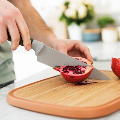 - Thanks to the wide, sharp blade it’s also suitable for light cleaving jobs. Ergonomically designed handle for a firm and safe grip. The blade’s non-stick coating ensures the food doesn’t stick to the knife. Use the protective sleeve to conveniently store the knife and protect hands as well as the blade.