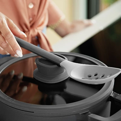 - Practical spoon rest feature allows you to conveniently rest your cooking spoon or utensil on top of the saucepan while you attend to other tasks in the kitchen. Its integrated draining hole that doubles as a steam vent. This clever design allows you to easily drain excess liquids from your cooked food without the need for a separate colander or strainer.