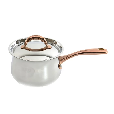 - Package includes 18/10 stainless steel 6.25″ Saucepan, 9.5″ Fry pan, 9.5″ Deep Skillet with helper handle and 2x Lids. Featuring sleek mirror finish and ergonomically designed rose gold handles for a firm, secure grip. Save valuable kitchen space utilizing the hanging loop and store your cookware within reach.