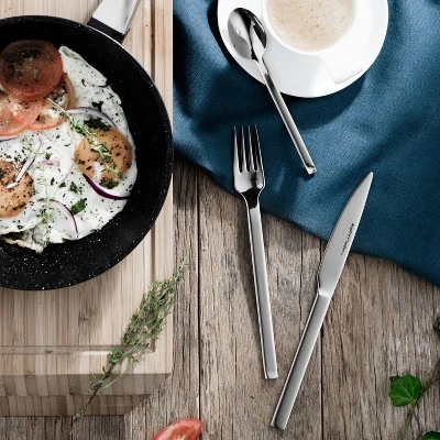 Designed by award-winning designer Ralph Krämer. Straightforward yet dynamic, the Essence flatware exudes a masculinity that stands out on the dinner table. With this set of cutlery designer Ralph Kraemer created precise and harmonious flatware that nicely balances rectangular surfaces with clear curves. It combines a sober design and technique, which results in a charming and attractive symmetry giving the cutlery a well-proportioned look. 30 Pc Essene design set is the epitome of elegance and style. We all know fashion trends are usually short-dated, but products and especially flatware needs to be timeless. Service for 6 guests. Package includes: 6x 8.75″ Knives, 6x 8.25″ Spoons, 6x 8.5″ Forks, 6x 6″ Cake Forks, 6x 5.75″ Coffee/Tea Spoon