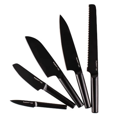 - Package includes: Bread knife 9″, Chef’s knife 7.5″, Santoku knife 6.25″, Vegetable knife 4.75″, Paring knife 3.25″ and wood block. Unleash your culinary creativity with our premium knife set, crafted from stainless steel with Titanium PVD non-stick, non-toxic coating and an ergonomically designed hollow handle that provides optimal control. Includes a wooden block with a nonskid, nonslip base that provides extra stability when storing your knives safely.