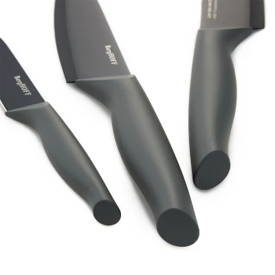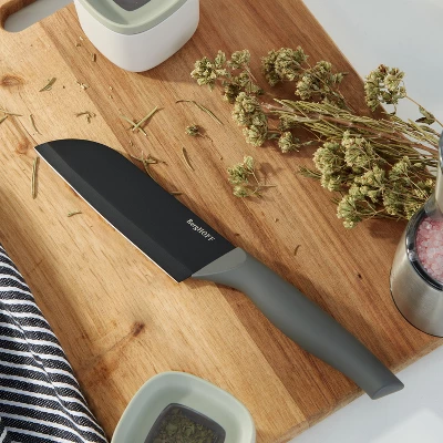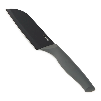 - Stainless steel 5.5″ Santoku knife with nonstick ceramic coating and ergonomic PP handle. Includes PP protective sleeve.